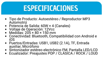 Tipo de Producto: Autoestéreo / Reproductor MP3 Automotriz